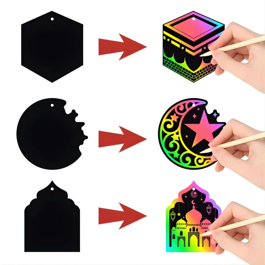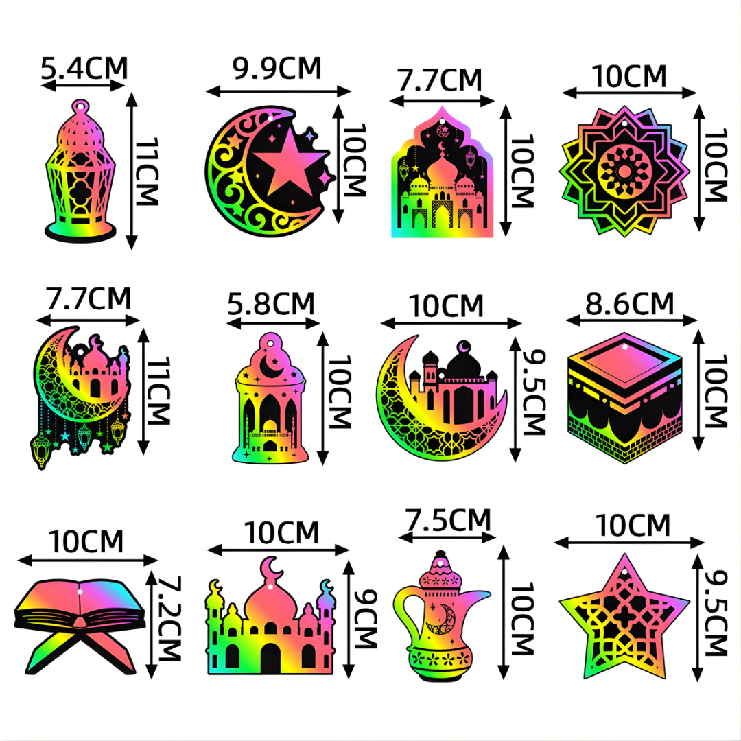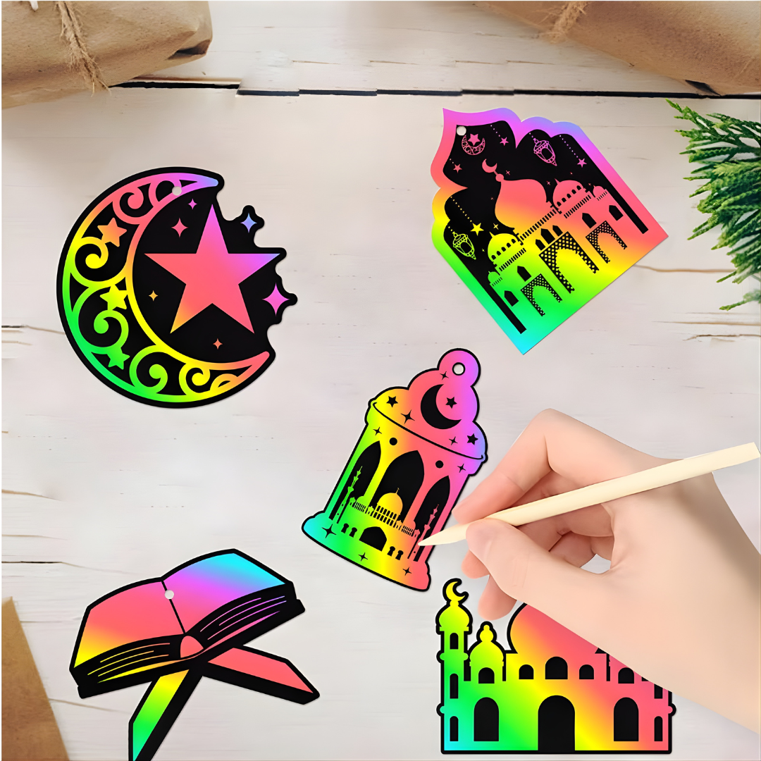 šĀ All-inclusive set -Ā A set of 24 Ramadan themed ornaments, 10 gratitude notes, 5 wooden styluses and the ribbons!